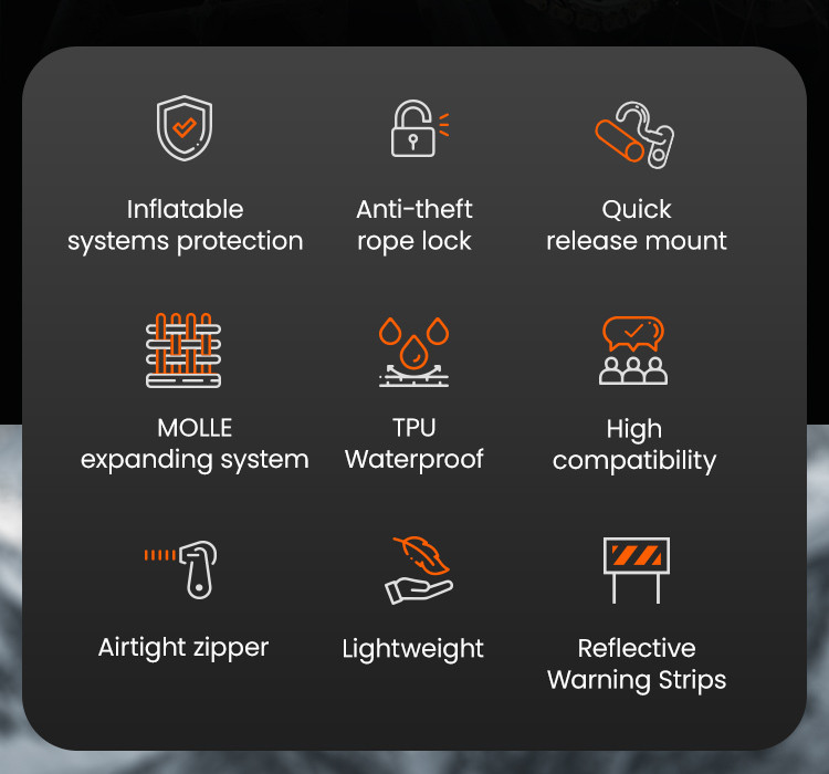 Cechy wodoodporności i zabezpieczenia przed kradzieżą: Wykonana z wodoodpornej tkaniny kompozytowej TPU z certyfikatem IPX7 i wodoodpornymi zamkami błyskawicznymi, dzięki czemu sprzęt pozostaje suchy nawet podczas ulewnego deszczu. Zintegrowany system antykradzieżowy zapewnia dodatkową warstwę bezpieczeństwa.