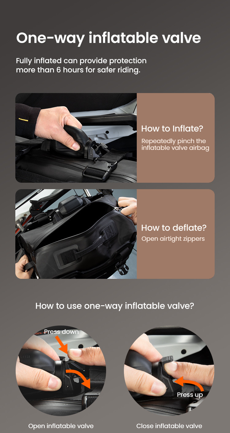 System ochrony przed napompowaniem: Zapewnia wyjątkową ochronę pasywną, o nośności ponad 300 kg podczas upadków lub wypadków, skutecznie chroniąc kierowcę, pasażera i pojazd, zwiększając bezpieczeństwo jazdy.