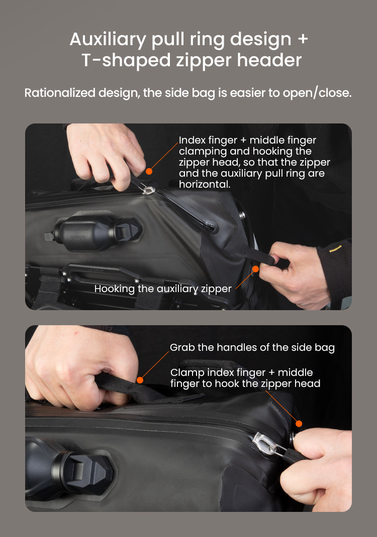 Szybki dostęp: Wyposażony w pomocniczą zakładkę i zamek błyskawiczny w kształcie litery T, umożliwiający użytkownikom otwieranie i zamykanie bocznej torby bez wysiłku, zapewniając jednocześnie szybki dostęp do przedmiotów.