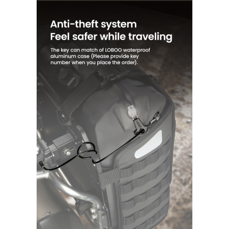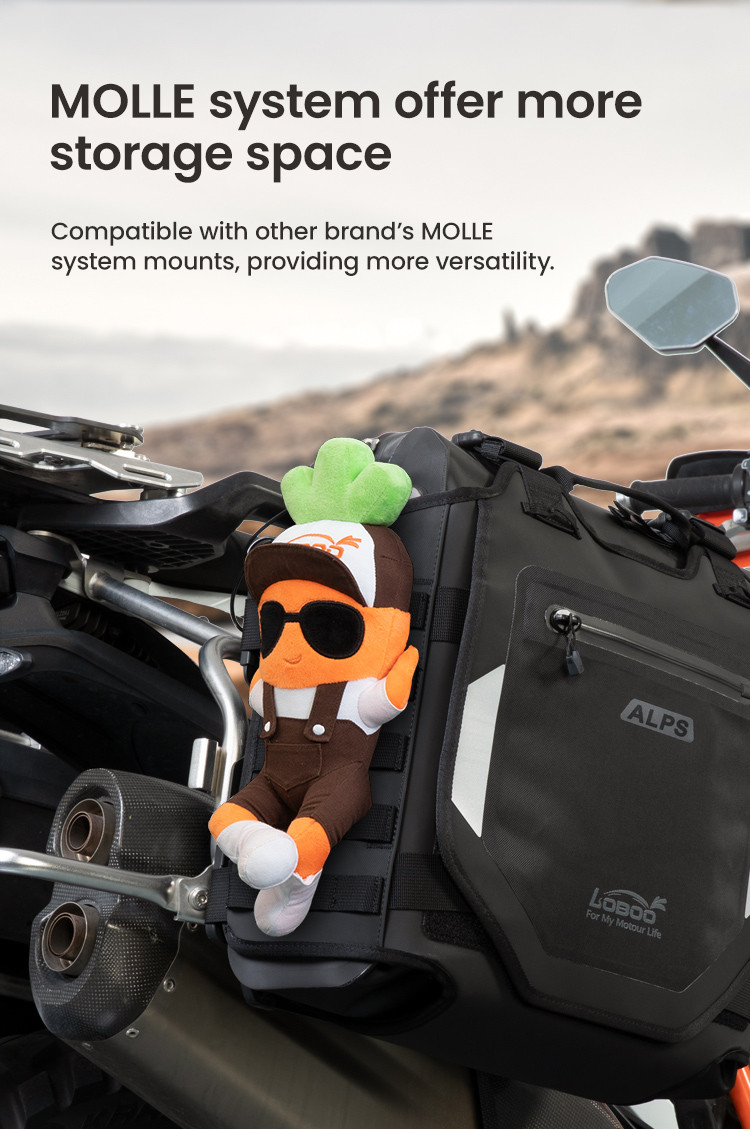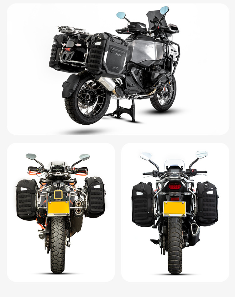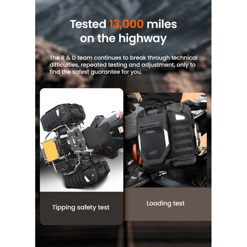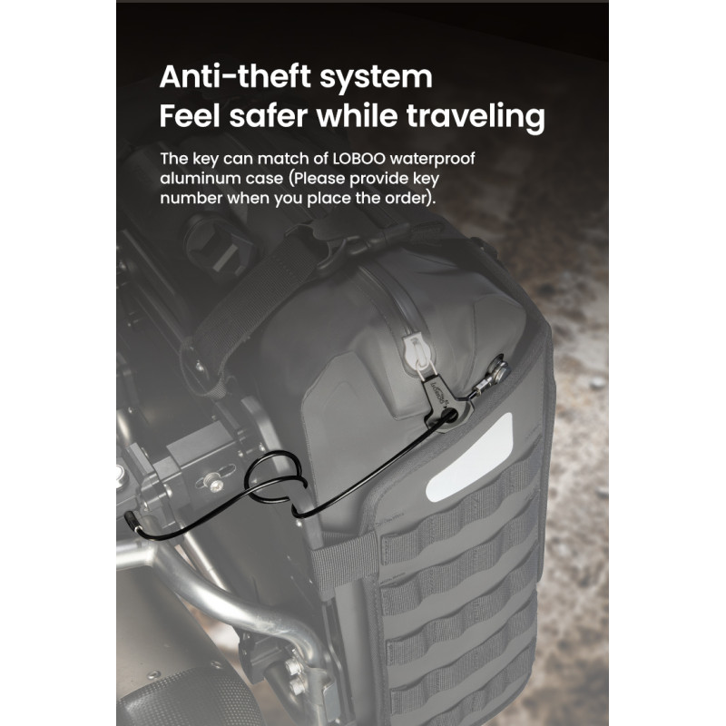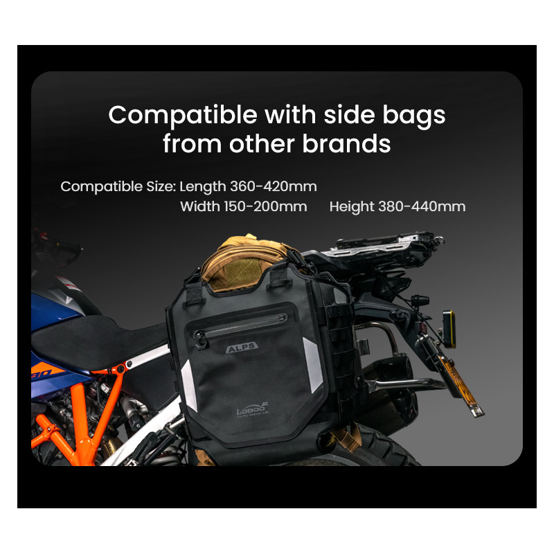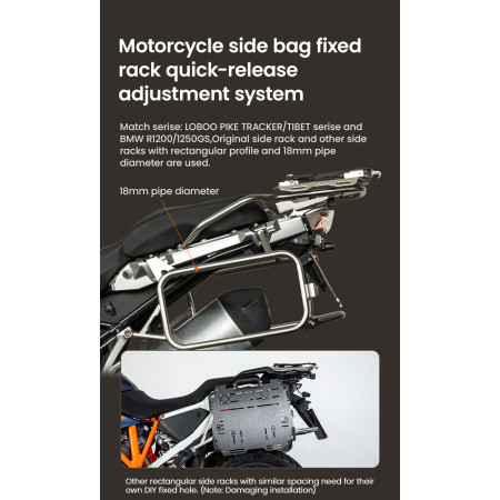 Regulowana struktura szybkiego montażu: Zaprojektowany z myślą o kompatybilności z bagażnikami serii LOBOO TIBET i PIKE TRACKER, a także oryginalnymi bagażnikami bocznymi BMW.