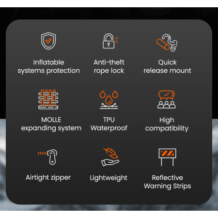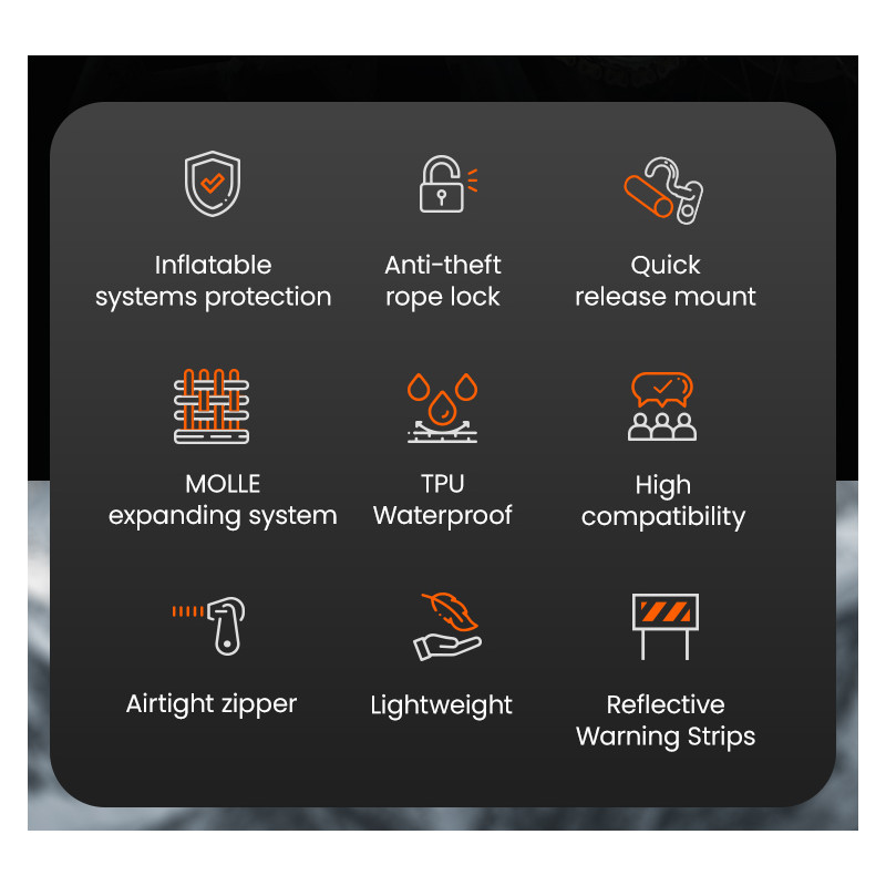 Cechy wodoodporności i zabezpieczenia przed kradzieżą: Wykonana z wodoodpornej tkaniny kompozytowej TPU z certyfikatem IPX7 i wodoodpornymi zamkami błyskawicznymi, dzięki czemu sprzęt pozostaje suchy nawet podczas ulewnego deszczu. Zintegrowany system antykradzieżowy zapewnia dodatkową warstwę bezpieczeństwa.