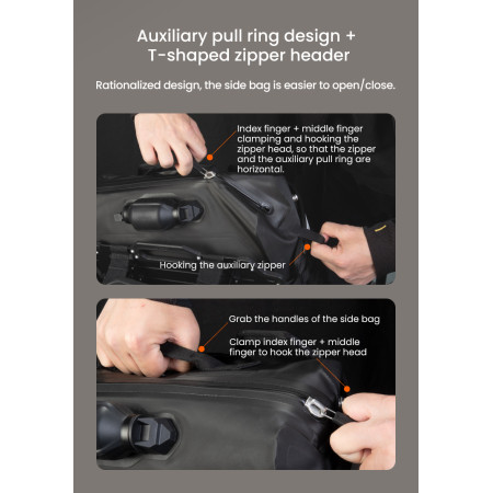 Szybki dostęp: Wyposażony w pomocniczą zakładkę i zamek błyskawiczny w kształcie litery T, umożliwiający użytkownikom otwieranie i zamykanie bocznej torby bez wysiłku, zapewniając jednocześnie szybki dostęp do przedmiotów.