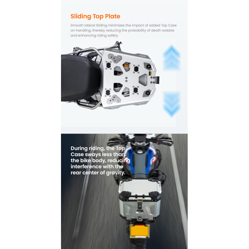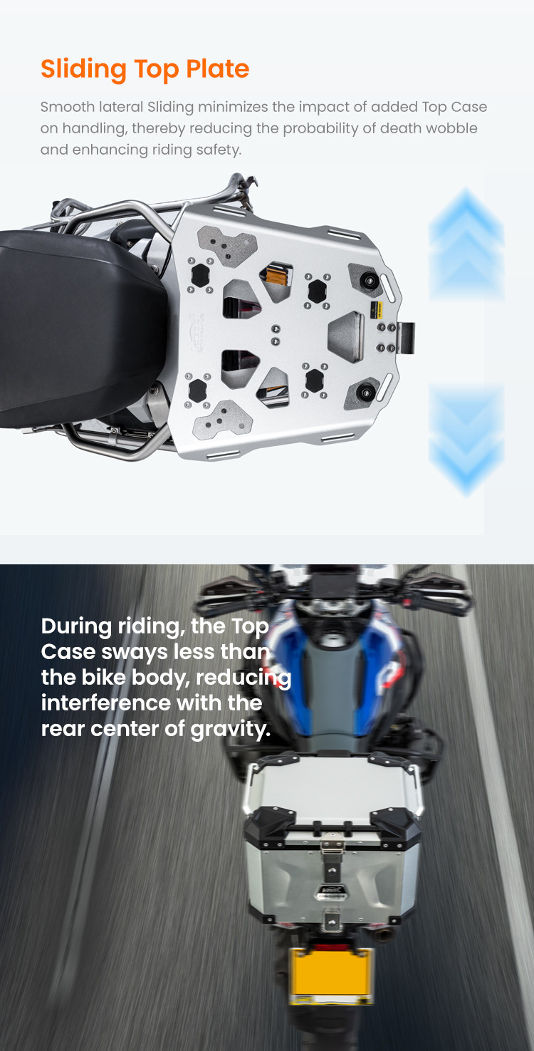 Największą zaletą wersji pływającej jest jednak jej działanie w trasie. Konstrukcja pracuje płynnie na boki, co pomaga ograniczyć negatywny wpływ dodatkowego bagażu na prowadzenie motocykla. W praktyce oznacza to bardziej naturalne zachowanie maszyny, większy spokój podczas szybszej jazdy i mniejsze ryzyko nieprzyjemnych drgań czy tzw. high-speed wobble, znanego motocyklistom jako „death wobble”. To rozwiązanie szczególnie docenisz w dalekiej turystyce, kiedy kufer centralny jest realnie załadowany, a motocykl ma nadal prowadzić się pewnie i przewidywalnie.