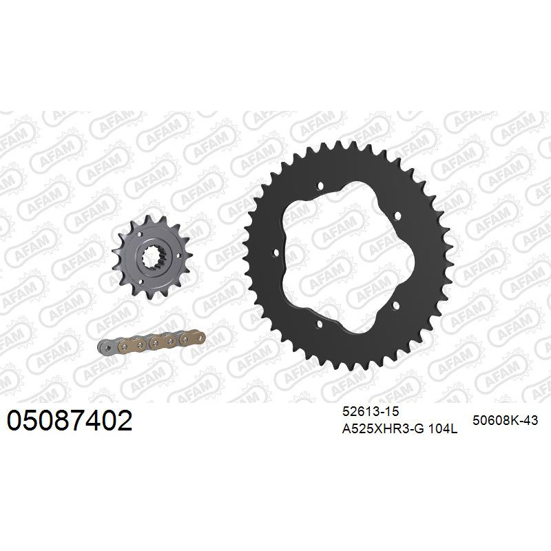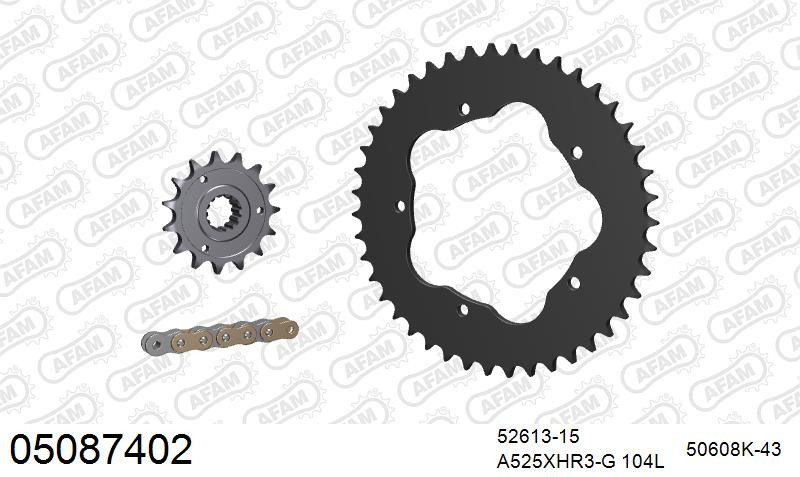 AFAM Zestaw napędowy (stal) DUCATI 998 S4R S TESTA FOR PCD2 2006-2008 (łańcuch A525XHR3-G 104L, zębatki 15, 43)