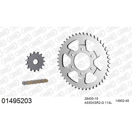 wishlist porównaj Szybki podgląd Nowy AFAM AFAM Zestaw napędowy (stal) HYOSUNG 125 COMET 2006-2015 (łańcuch A428XMR2-G 136L, zębatki 14, 52) 407,00 zł Dodaj do koszyka Dostępność: Out of stock
