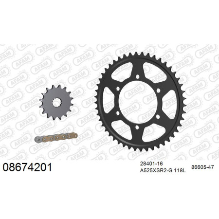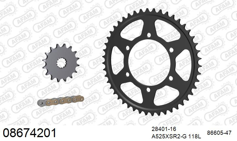 AFAM Zestaw napędowy (stal) TRIUMPH 675 STREET TRIPLE 2013-2016 (łańcuch A525XSR2-G 118L, zębatki 16, 47)